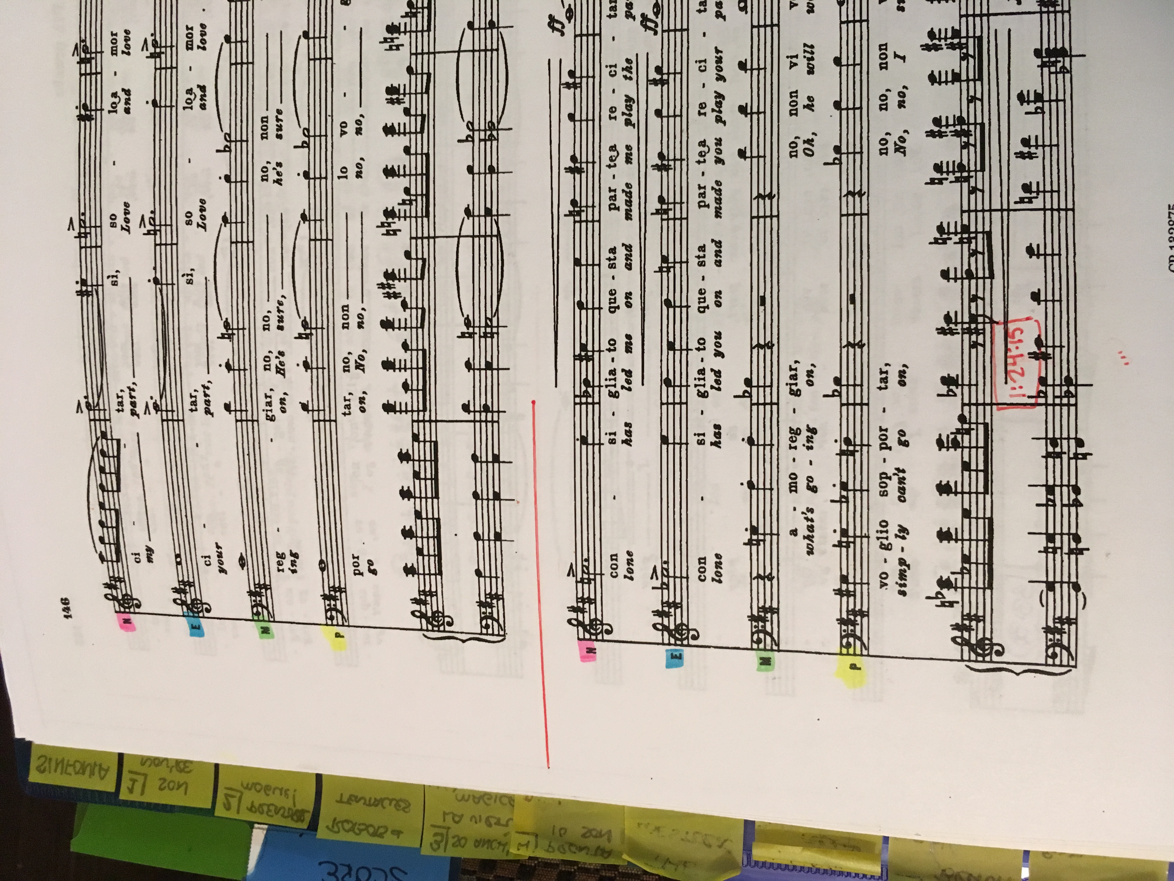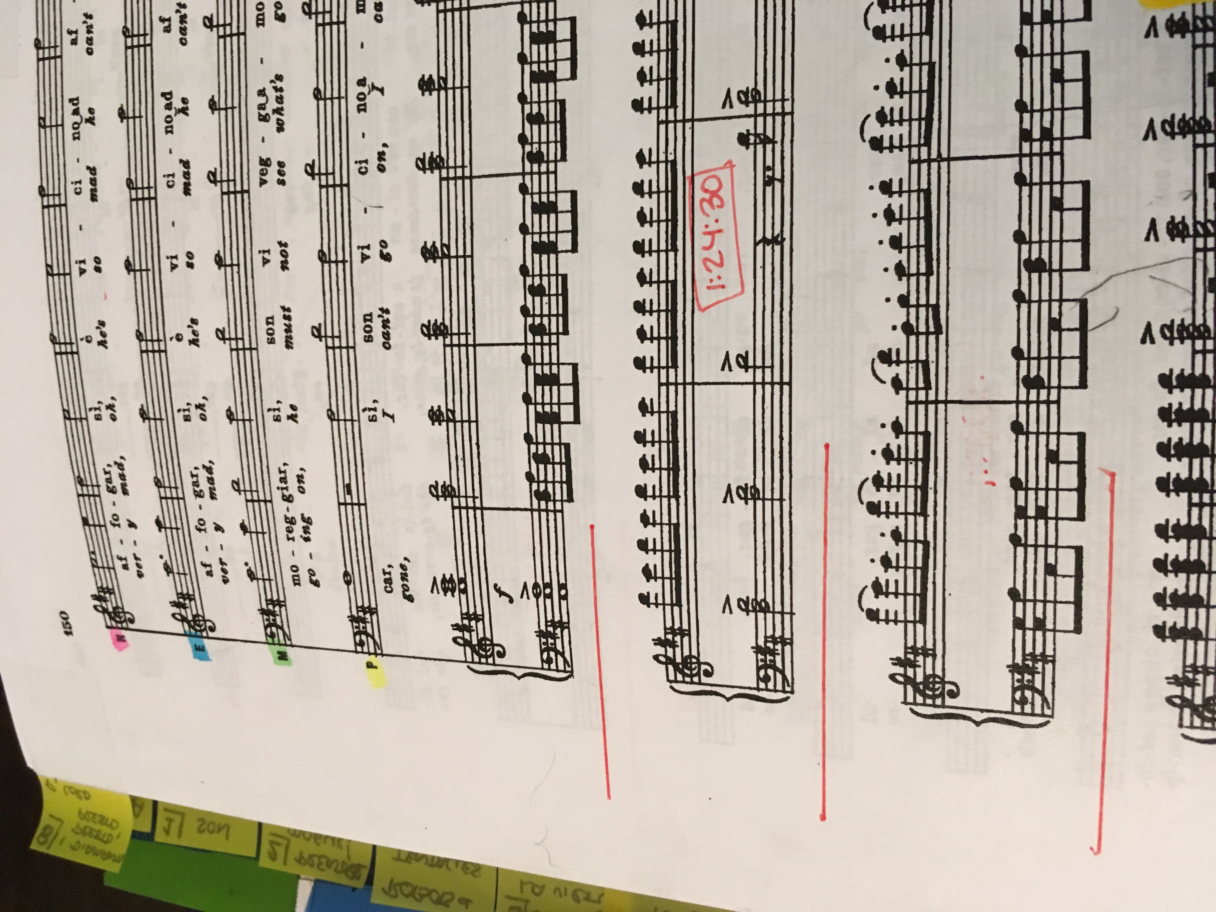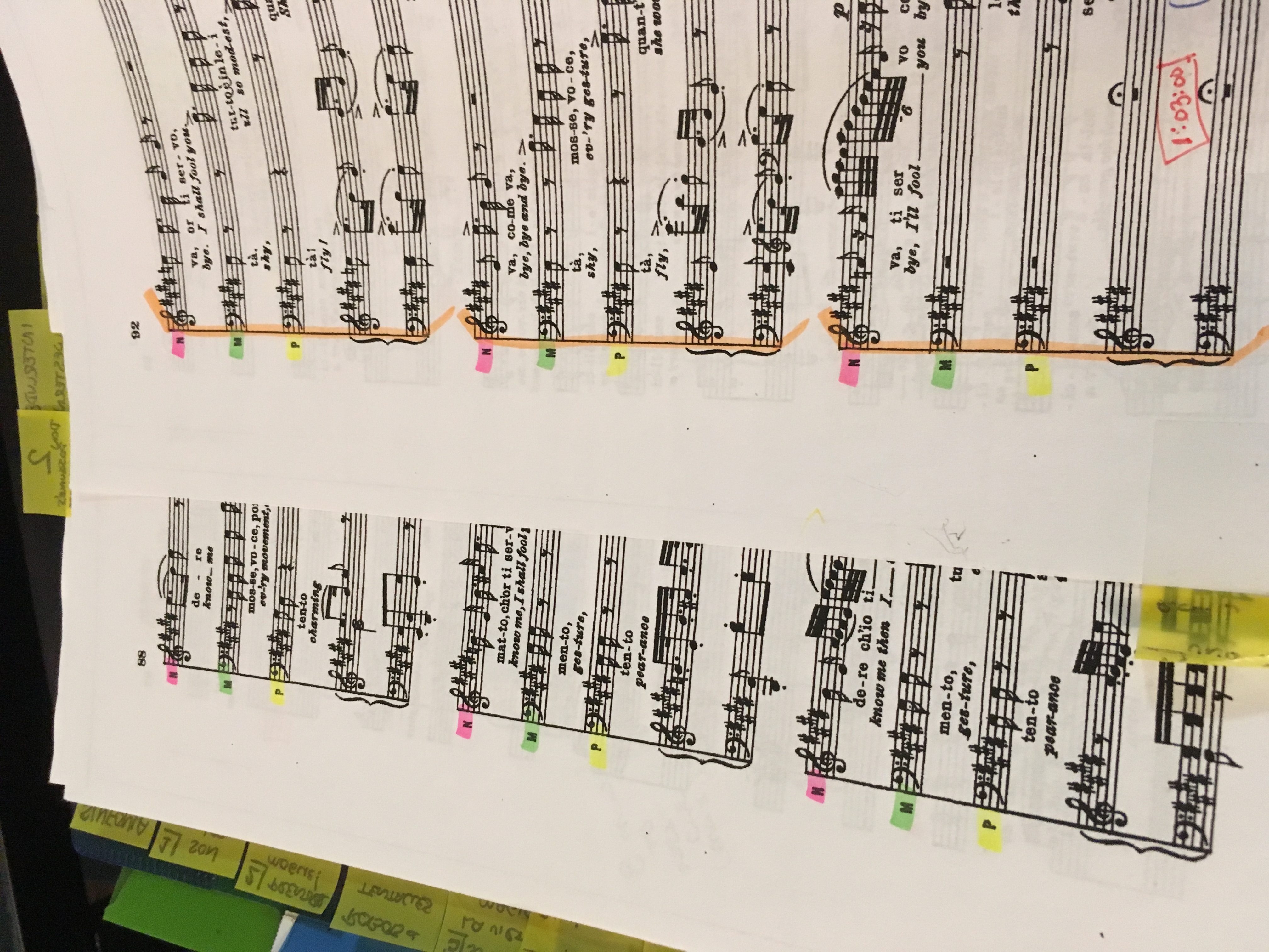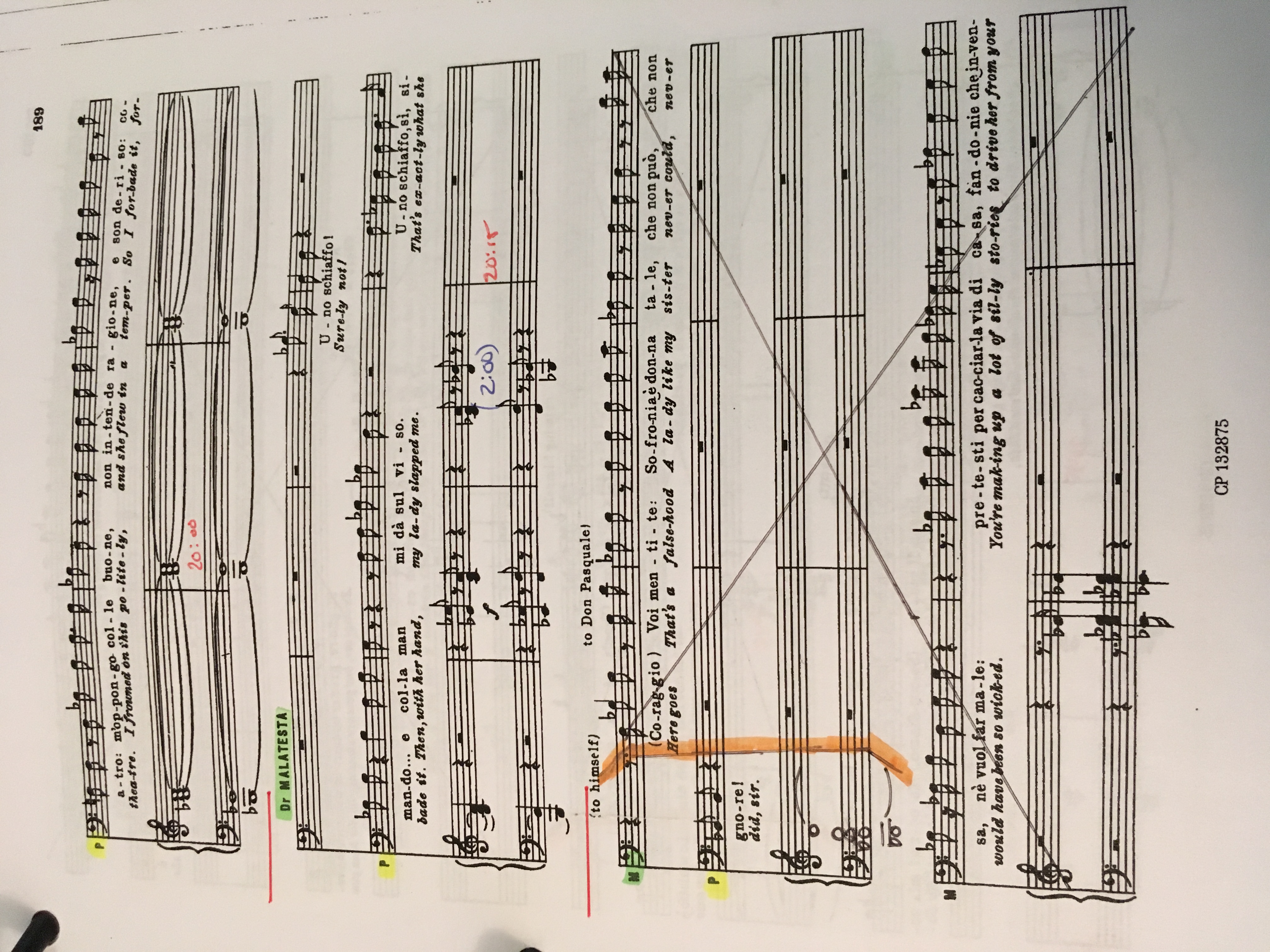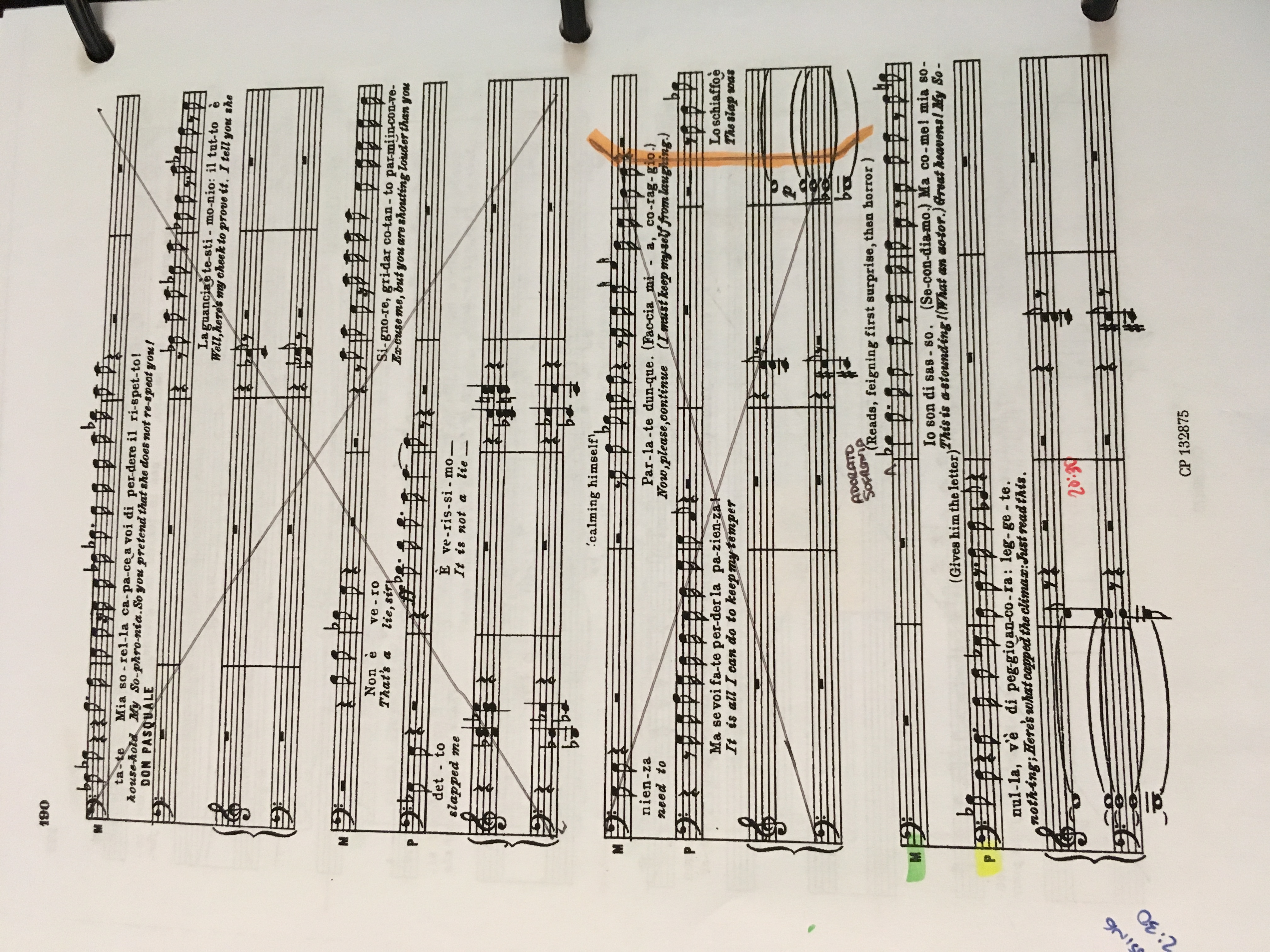 Both musicals and operas tend to* start with working through the music first. This can sometimes take several days in a musical, depending on how prepared the actors are, including how well they sightread. In an opera setting, singers are expected to come fully prepared on the music, often having had private coachings on their own (or if local and comprimario/smaller roles, perhaps coachings from someone within the same opera company). The first sing-through then is more about setting tempi and assuring everyone agrees on the same cuts in the music, though a preliminary list of changes was already sent to all involved. Depending on the opera company, there may be an entire music department who deals with those changes, especially to transfer the information to the orchestra, but I dutifully note any changes in the daily report. As mentioned previously, placement in the music is notated with slashes in between, so the pictures below represent the following note, ‘CUT: 68/3/3/2 (after “Io stesso? E come?”) to 69/2/4 “In una canzonetta”.’